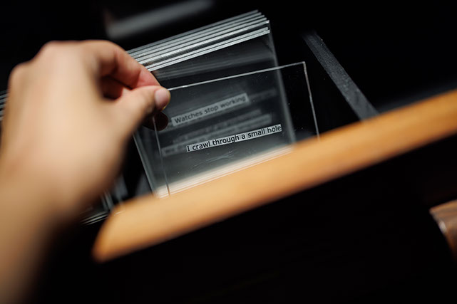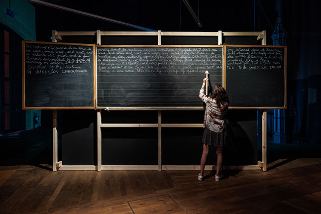 The visitors are drawn into this surreal landscape, moving through the space as if in a dream; they are then invited to participate by selecting a dream from the AI's archive and writing it by hand on the blackboard with the provided chalk.