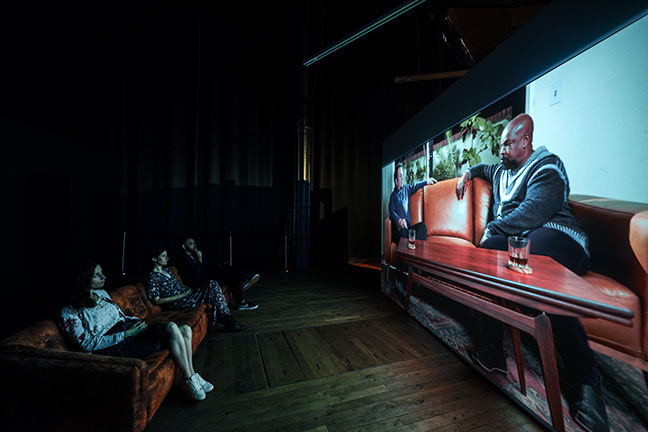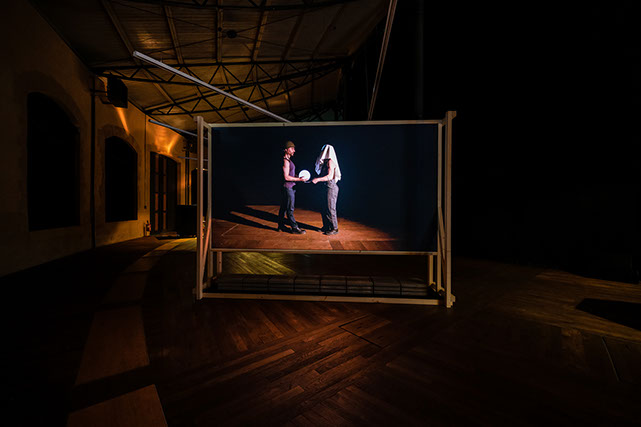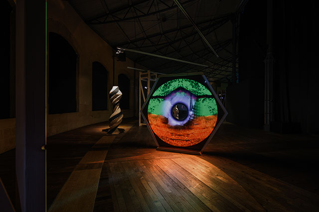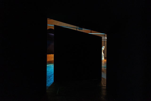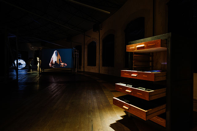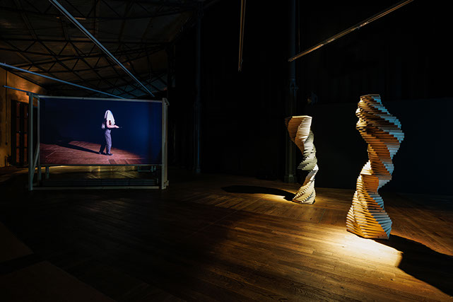 a series of atmospheric chambers, woven together by a closed-loop sequence, where sculptural forms, video projections, musical compositions and staged performances take turns appearing and disappearing.